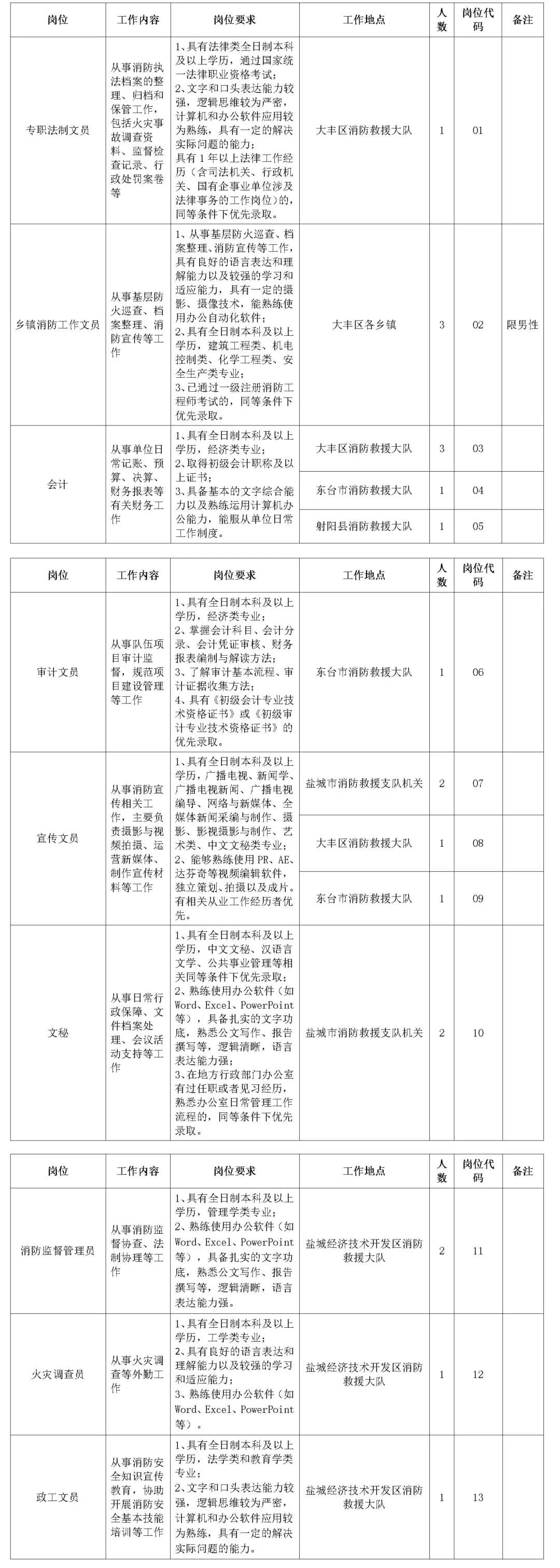 为加强盐城市消防救援支队灭火防火和应急救援力量建设,根据工作需要,现面向社会公开招聘消防文员,具体招聘事宜公告如下: