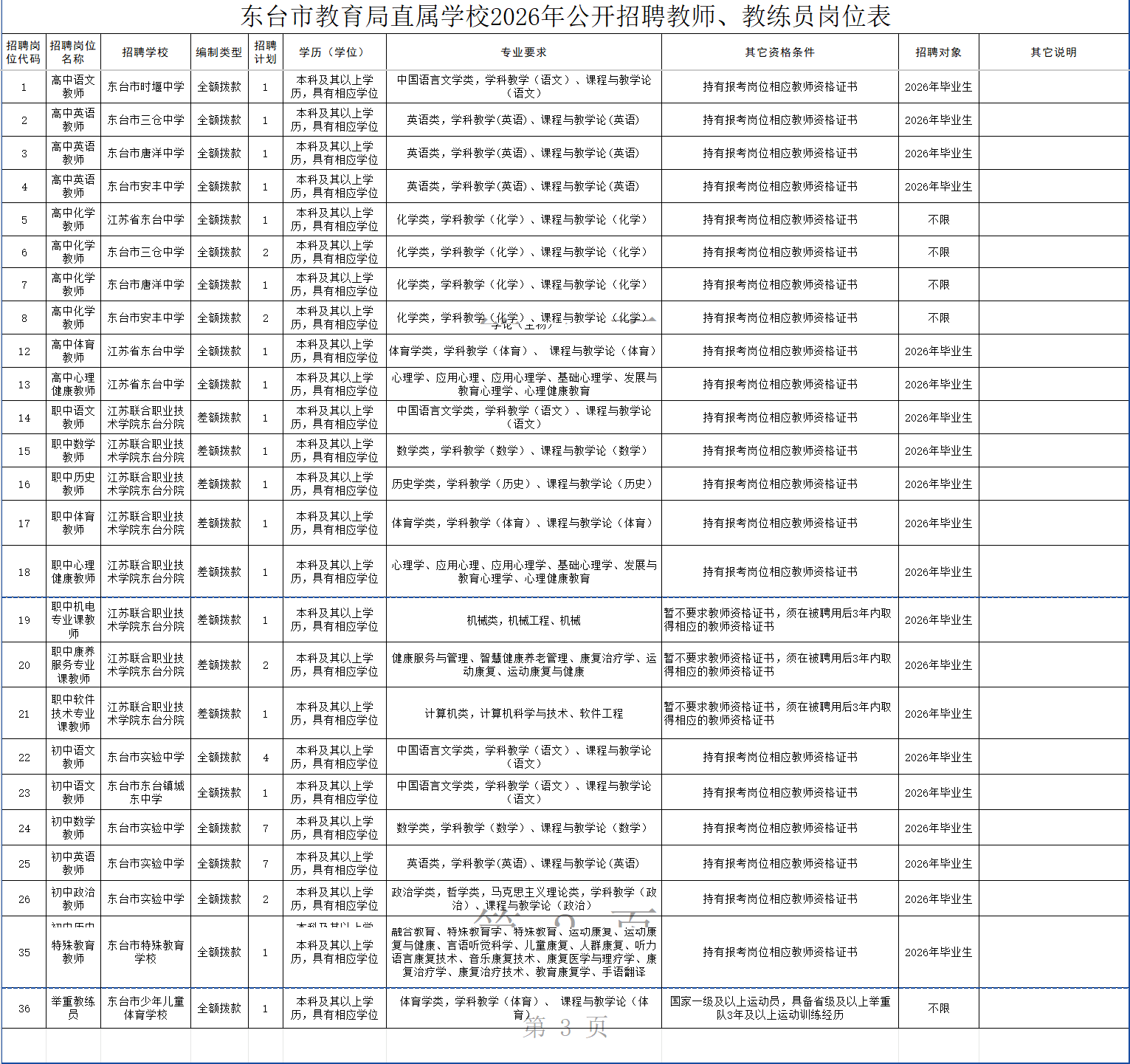 招聘岗位及条件等详见附件1《东台市教育局直属学校2026年公开招聘教师、教练员岗位表》(以下简称“《岗位表》”),可在东台市政府网站下载查询。